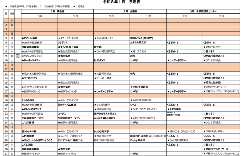 毎月のイベント(都福祉会館便り)と各部屋の利用状況(予定表)を掲載しています。